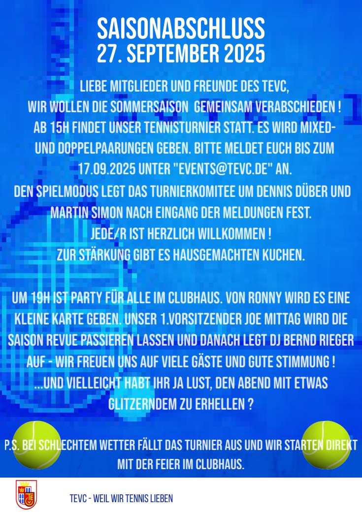 Ab 01.05.2025 wird Vinzent Banzer mit seiner Tennis Academy die Tennisschule im TEVC leiten und ist somit Ansprechpartner für Jugend- und Erwachsenentraining. Vinzent ist Inhaber einer DTB A-Trainerlizenz und wird auch unsere sportlichen Mannschaften mit seinem Trainerteam betreuen. Vinzent wird sich und sein Team in der Mitgliederversammlung (voraussichtlich Ende März) vorstellen. Wir freuen uns, dass wir mit Vinzent eine hervorragende Lösung dieses für den TEVC wichtigen Zukunftsthemas gewonnen haben.